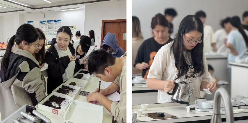 茶叶审评模块,同学们以《茶叶感官审评》课程理论为支撑,从外形、汤色、香气、滋味、叶底五大维度,对绿茶、红茶、黑茶等多品类茶叶开展系统审评。教师先详解审评器具使用规范与评分标准,同学们再分组实操,借助专业审评杯碗,通过“看、闻、尝”精准辨别茶叶品质优劣。过程中,大家对照理论知识反复推敲,比如依据“红茶金圈显、绿茶汤色亮”的要点,修正审评操作细节,真正实现“识茶辨茶”的理论落地。
