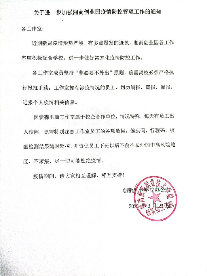 湘商创业园发布疫情防控管理通知