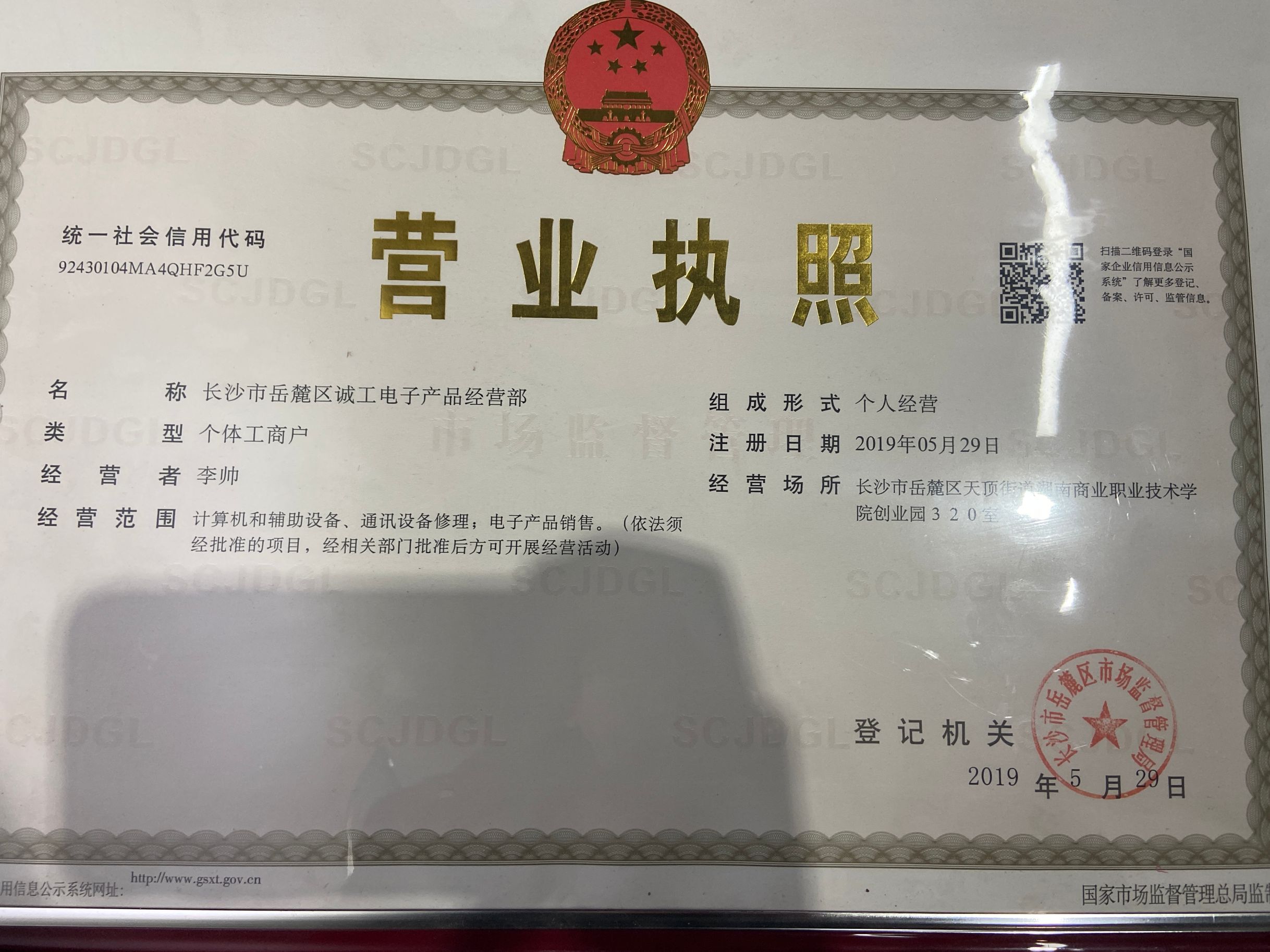 2019年5月,获得了国赛二等奖之后,在学校湘商创业园申请了一间工作室,专门做电子产品维修和销售,命名为诚工科技,寓意着诚信品质及工匠精神。