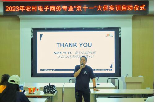 为促进我院特色校企合作教学实践的发展,加强高素质应用型人才的培养,锻炼学生专业技术能力,10月16日晚上,电商学院与NIKE企业在J1-101举办了农村电子商务专业“双十一”大促实训启动仪式。参与大会的有电商学院党总支副书记刘明浩以及农村电商专业全体学生。