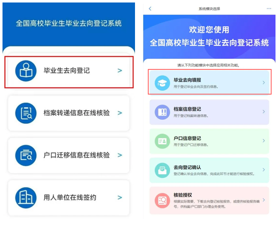 毕业生本人微信关注“国家大学生就业服务平台”公众号,点击“去向登记”登录。
