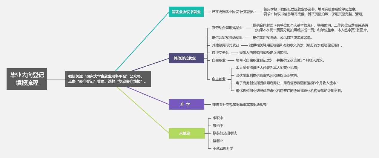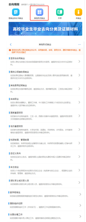 以签劳动合同就业、提供公招接收函就业、其他录用证明就业、国家基层项目、地方基层项目、科研助理、管理助理、应征义务兵、自主创业、部队军士或文职人员、医学规培生、国际组织任职、出国出境工作的情况,请点击“其他形式就业”,并根据自身实际情况填写和提交材料。