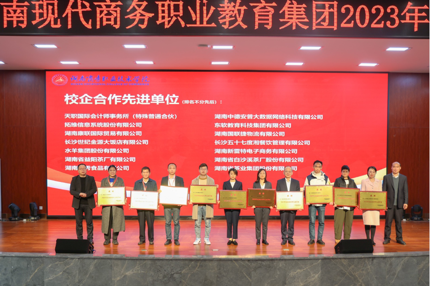 大会对拓维信息系统股份有限公司等14家“湖南现代商务职业教育集团2023年度校企合作先进单位”、阳国秀等16名“湖南现代商务职业教育集团2023年度校企合作先进个人”、“数智财务”职业教育示范性虚拟仿真实训基地项目等7个“湖南现代商务职业教育集团2023年度校企合作优秀项目”进行现场表彰。