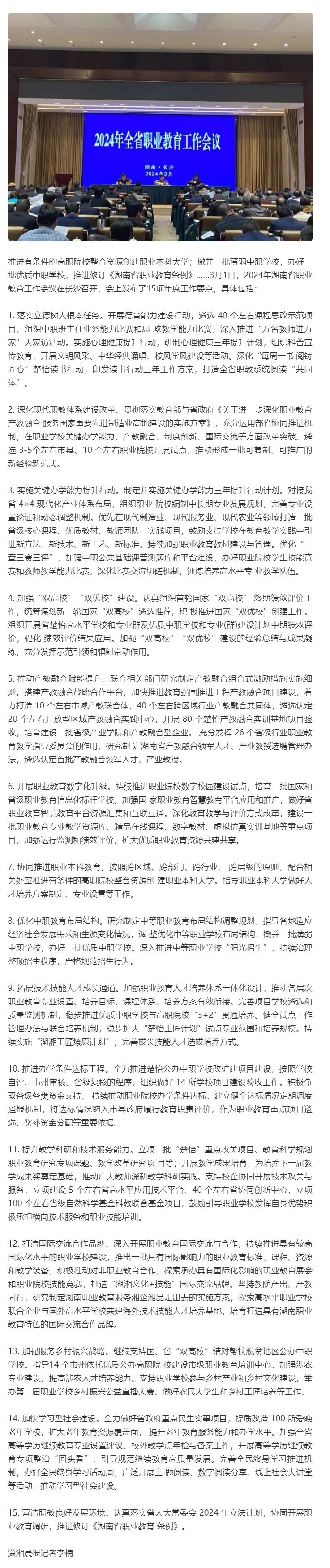推进有条件的高职院校创建职业本科大学湖南职教划2024重点