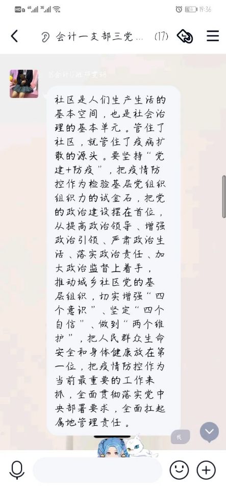 杨巧:抗击疫情,疫情就是命令,防控就是责任。把好疫情防控的入口关,当好疫情防控的“守门员”。 各社区的疫情防控工作也更加严格,面对当前的疫情要严格按照上级的要求,切实加强社区防控,严防严控、严防死守。在疫情面前,作为一名学生党员要同人民群众同舟共济,共同构筑起疫情防控的“钢铁长城”。