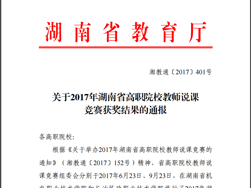 关于2017年湖南省高职院校教师说课竞赛获奖结果的通报