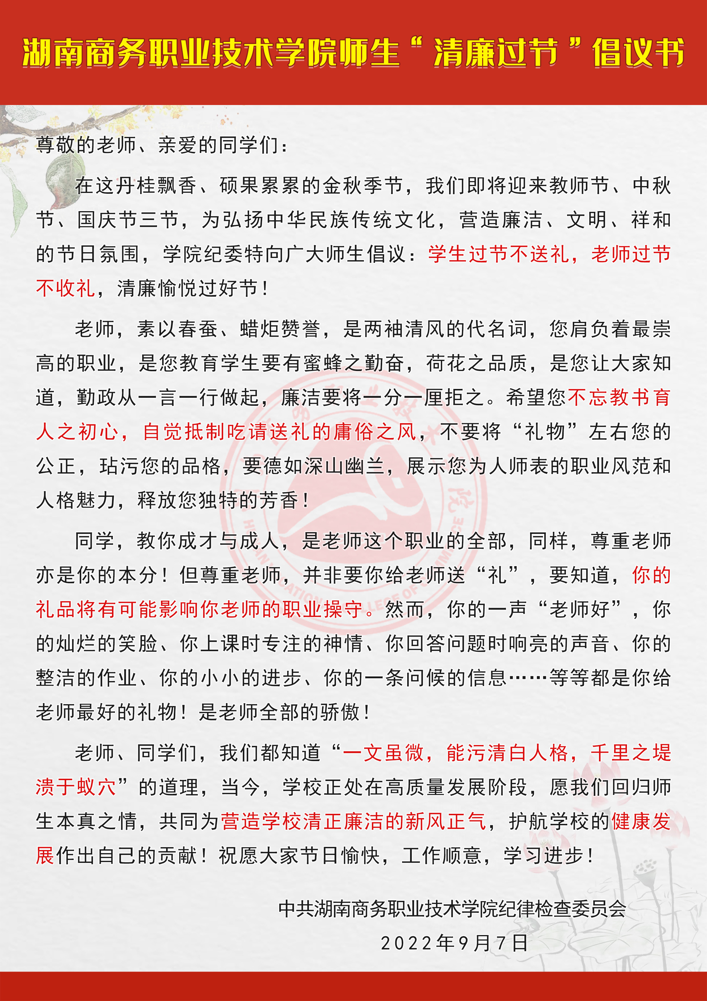 湖南商务职业技术学院师生“清廉过节”倡议书