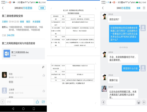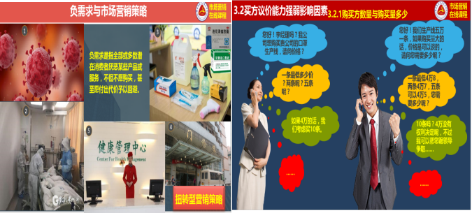 精心挑选教学内容,疫情案例无痕植入。在教学资料的准备过程中,教学团队成员借助各类营销公众号等学习平台搜集大量疫情相关的企业案例,在各知识点中有机融入。如在“需求状态与营销任务”一节授课内容中, 以“病毒感染医疗需求”为例说明负需求概念以及应对措施学生深有感触,在“行业环境分析”内容中用“口罩设备购进”模拟活动来解释买方讨价还价能力就比较容易被学生理解。课后在学习通讨论区中通过播放“转行做口罩暴富”、 “中国疫情引起世界厕纸抢购风潮”、“瑞幸咖啡千里送无人咖啡机” 等新闻来设计与知识点及思政相关思考题引导同学们参与讨论,在知识拓展栏目录制了“2020年新冠疫情后的行业机会”等疫情主题的营销讲座拓宽学生视野同时提高学生职业敏锐度。