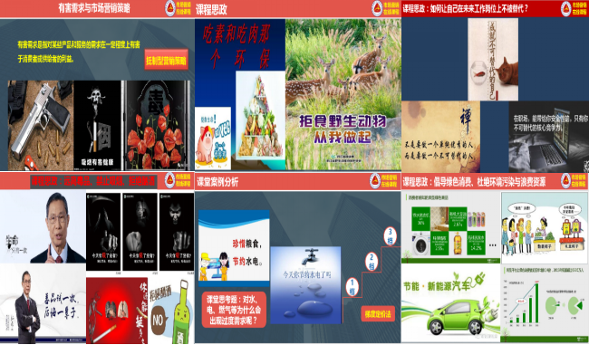 巧妙设计教学环节,疫情思政无声链接。每一个教学内容中,王娜玲都会考虑怎么渗透“育人”内容。“祸福相依、危也是机”,疫情是最好的教育,灾难促使人类思考,促使人类反思。在新闻播出“病毒与野生动物捕杀食用相关”信息之后,课程团队第一时间更换“绿色营销观念”知识点的思政内容,提出“吃素与吃肉哪个更环保?”质疑式问题并播放“我们不是食物”的公益视频,倡导“拒食野生动物从我做起”;疫情期间“钟南山院士”不仅是民众心中的民族脊梁更是拯救英雄式存在,其影响力不容置疑,因此在“有害需求”知识点中渗入钟南山院士的“生命只有一次”的远离毒品的思政内容更能直击学生心灵;“慎独”是中国的古训,但喧嚣的生活剥夺了人们反思自己的时间,疫情期间的宅居独处却补偿了这种缺失,人如企业,在“替代品企业威胁”知识点中从企业引申到人,引导学生思考“如何让自己在未来工作岗位上不被替代?”