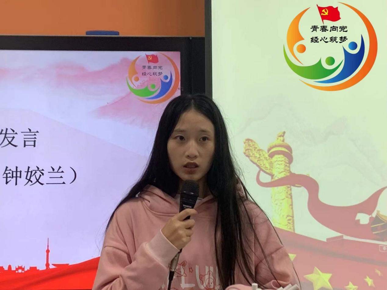 接下来,22级商管1班钟姣兰代表入党积极分子发言。她谈道:“我是一名普通的学生,但是不只是一名学生,更是一位党的忠实拥护者。在我还懵懵懂懂,无知无畏的时候,每次抬头看到我们的五星红旗,都会油然而生出一种敬畏之情。今天我们在这里一起学习培训,不仅仅是学习党的光辉历史,更要汲取它背后蕴藏的智慧和精神,要利用党的科学理论知识提高自身道德修养,树立正确的人生观、价值观和世界观,努力实现学习科学文化与加强思想修养的统一,努力实现学习书本知识与投身社会实践的统一,努力把自己培养成党和人民需要的、符合时代要求的高素质人才。”