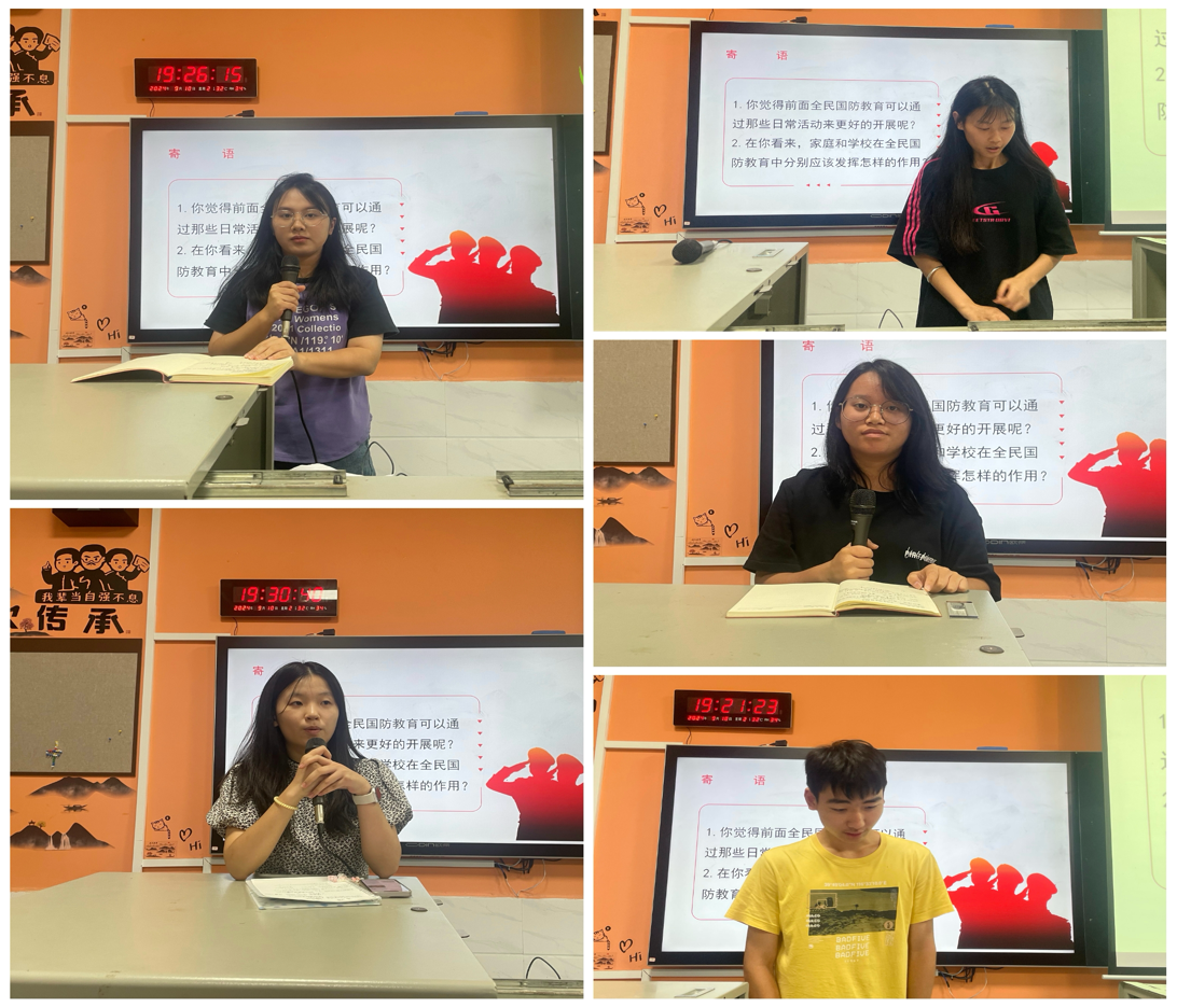 最后,在交流互动环节,大家积极发言,分享自己的想法和感悟。22级商务管理2班罗梦喜分享道:“在日常生活中,参加以学校为主体开展国防主题班会、知识竞赛、退役军人讲座及参观教育基地等等,这些都潜移默化地影响着我们,让我们从小在心中扎根国防观念,增强民族自豪感和责任感。作为大学生的我们也要行动起来,在日常学习和工作中,以高度的责任感和使命感,积极学习国防知识,增强国防意识,关心支持国防建设。”23级市场营销(楚怡)2班周创分享道:“国防建设,人人有责。参加本次国防教育党课,我深刻认识到国防对国家的关键意义。我国国防建设成就斐然,令人自豪。大学生的我们,要努力学习提升自我,积极传播国防知识,以青春之力为国家繁荣富强和国防安全贡献力量,共筑国家坚实护盾。”