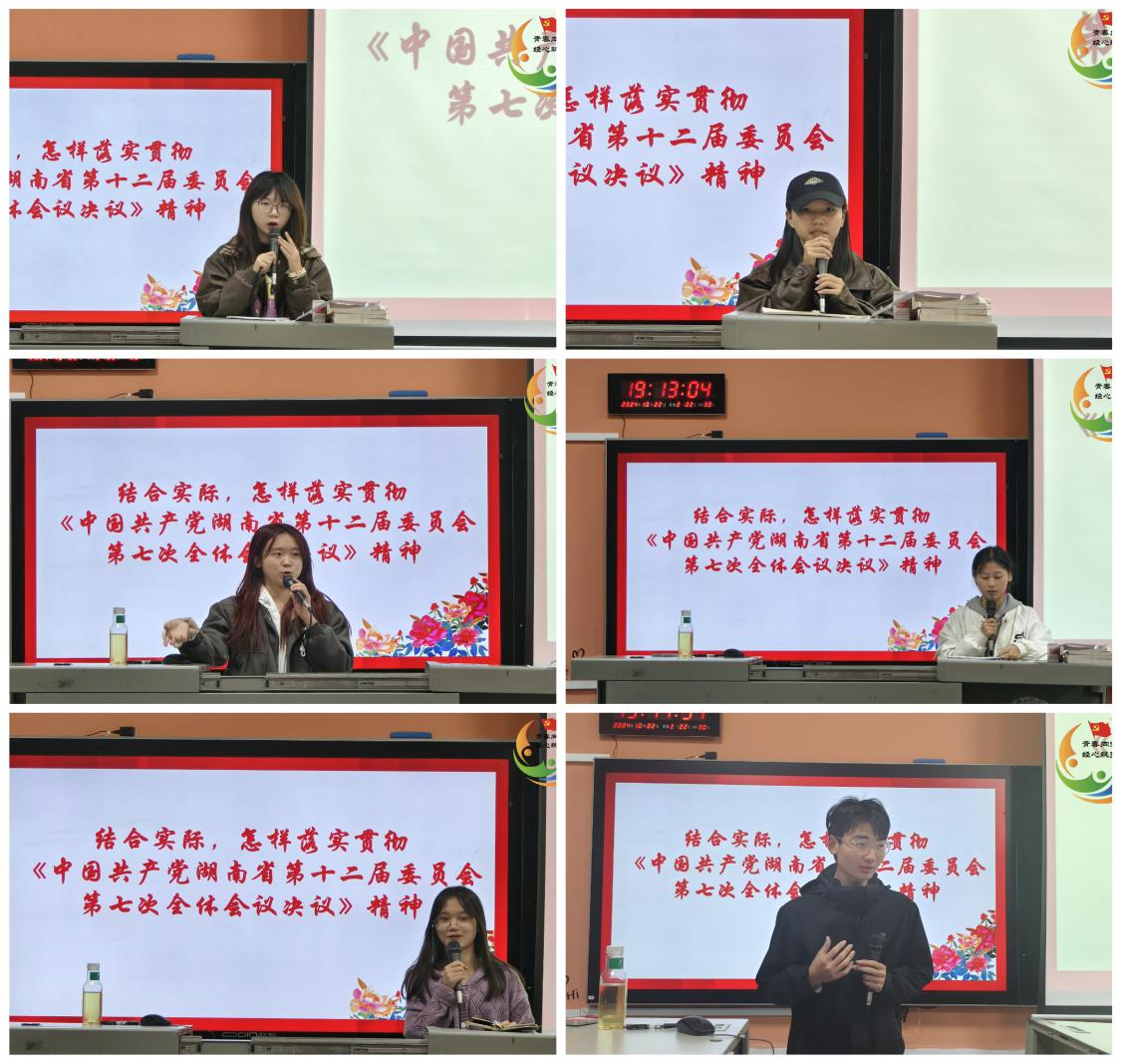 (通讯员 周贞)为深入学习和贯彻落实中共湖南省第十二届委员会第七次全体会议精神,夯实理论基础,增强实干本领,奋力谱写中国式现代化湖南篇章。2024年10月22日晚7点,经济贸易学院学工党支部在博学楼101教室(经济贸易学院分党校)组织开展“深入学习贯彻会议精神,奋力谱写新时代新华章”主题党日活动。此次活动由23级市场营销(楚怡)2班白一茜主持,经济贸易学院学工党支部全体入党积极分子参加此次活动。