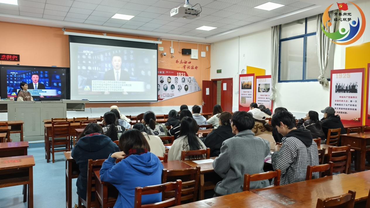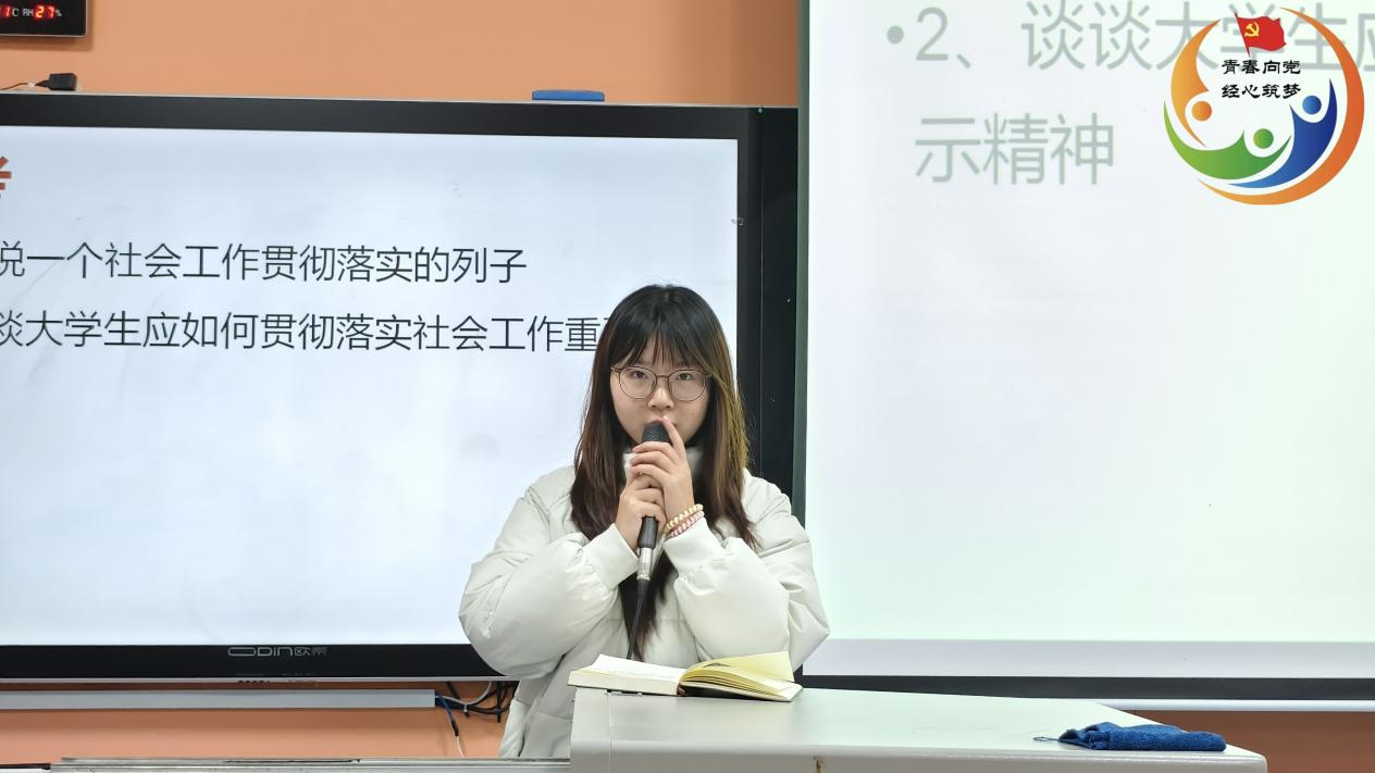 (通讯员 高静怡)2024年11月19日晚7时,经济贸易学院学工党支部在博思楼101教室(经济贸易学院分党校)组织进行“学重要精神,担青年使命”主题党日活动,集中学习近日习近平总书记对社会工作作出的重要指示精神。此次活动由入党积极分子23级物流管理2班彭淑雅主持,经济贸易学院学工党支部全体党员、入党积极分子参加此次活动。