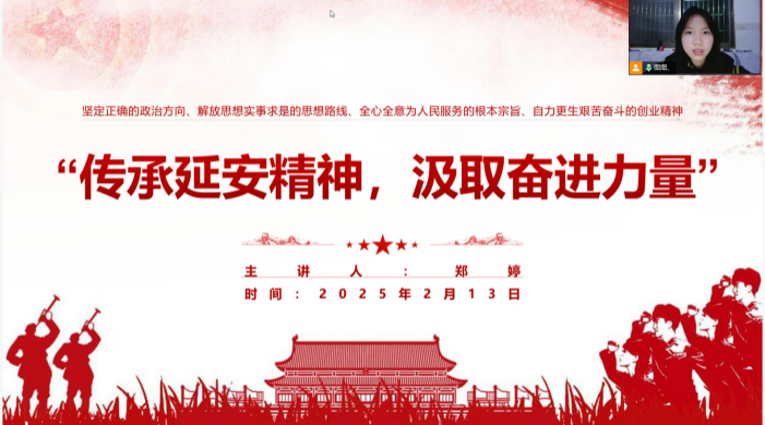 (通讯员 白一茜)延安圣地凝革命志,延河之畔聚奋斗心。2025年2月13日晚7时,经济贸易学院学工党支部组织开展“传承延安精神,汲取奋进力量”线上主题党日活动,本次活动由第五期“青春向党”先锋营副营长郑婷主持,经济贸易学院学工党支部全体党员、入党积极分子参与此次活动。