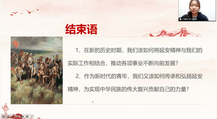 随后,主持人带领大家围绕“解读延安精神”“延安精神的现实启示”“中共领导论延安精神”三个方面深入学习了延安精神的内涵与时代价值。她强调,新时代大学生应深刻理解延安精神的核心要义,内化于心、外化于行,做到知行合一。