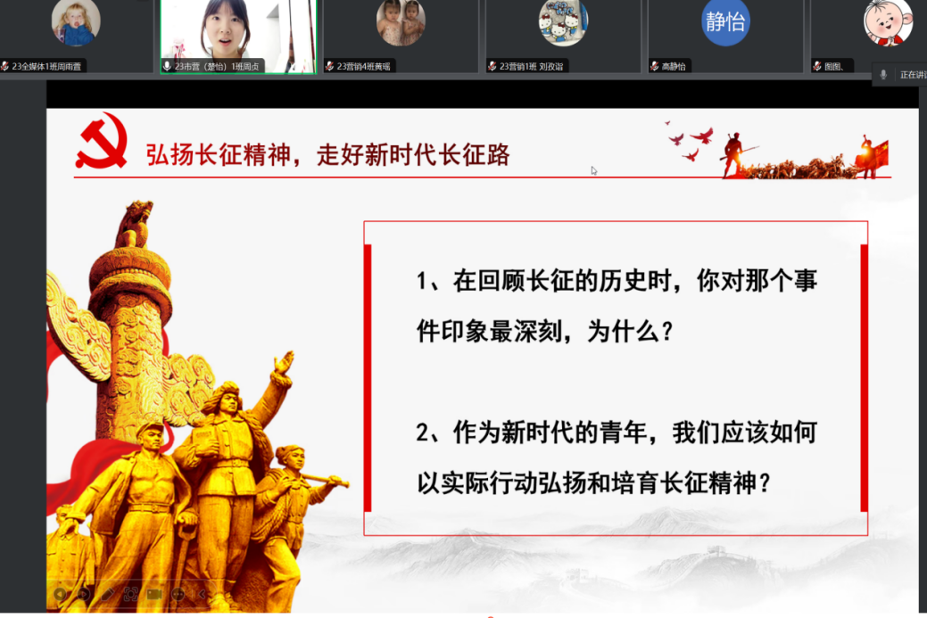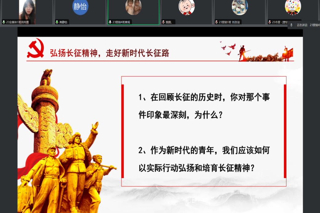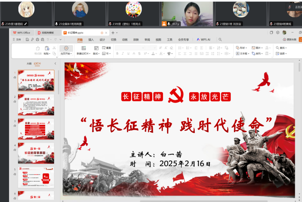 (通讯员 晏艳阳)为引导大学生从长征精神中汲取信仰力量,砥砺前行,2025年2月16日晚7时,经济贸易学院学工党支部组织开展了“悟长征精神,践时代使命”线上主题党日活动。本次活动由第五期“青春向党”先锋营副营长白一茜主持,经济贸易学院学工党支部全体学生党员、入党积极分子参与此次活动。