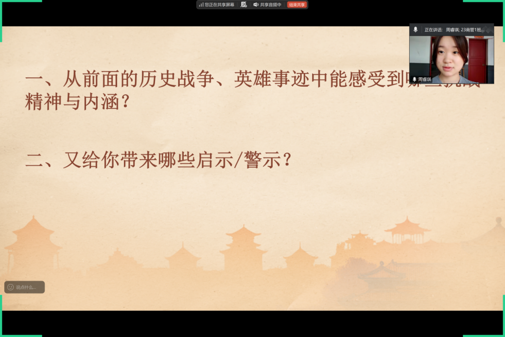 (通讯员 耿梓喆)为激发同学们的爱国热情,铭记历史。2025年9月10日晚7:30,经济贸易学院学工党支部组织开展“筑牢安全防线,守护人民生命”主题党日活动。本次活动由23级商务管理1班朱思丹同志主持,经济贸易学院学工党支部第五期先锋营全体成员及2025年第一批入党积极分子参与此次活动。