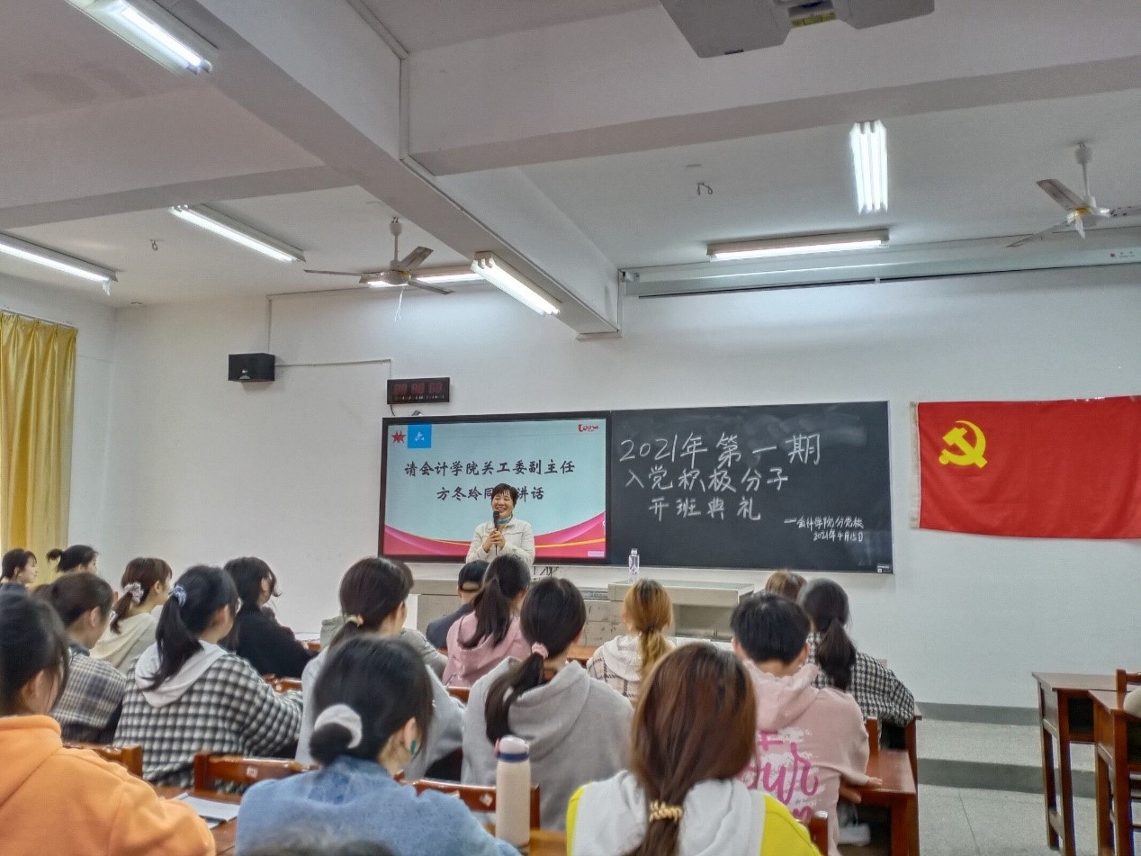 会计学院分党校于2021年4月15日12:10在二教301室举行了会计学院2021年第一期入党积极分子培训班开班典礼。培训班旨在加深学员对党的认识,端正入党动机,坚定入党决心,严格要求自己,争取早日加入党组织。来自19、20级各团支部共127位入党积极分子参加本期培训班,将进行为期21天的集中学习。