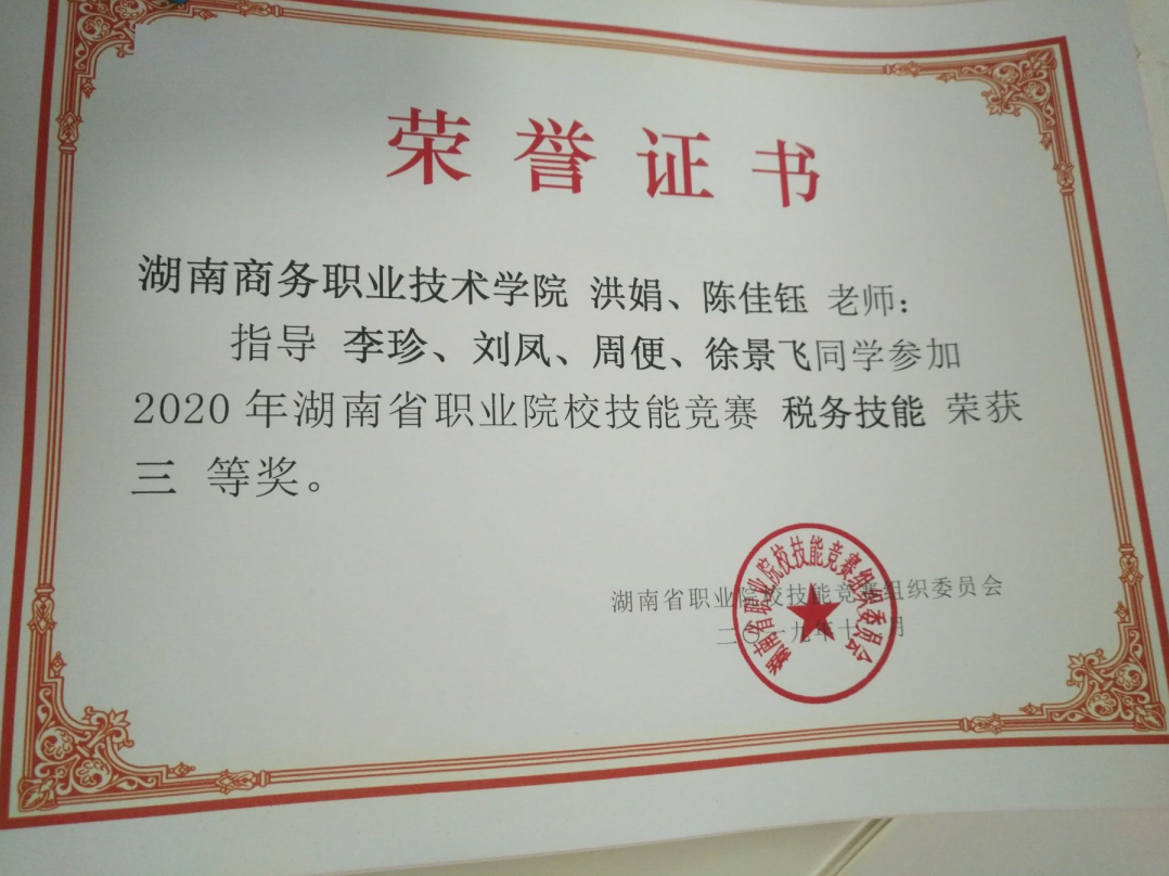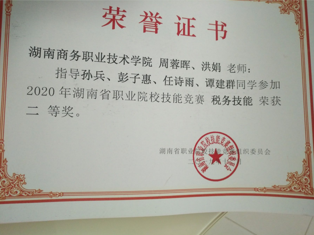 2019年12月,在2020年湖南省职业院校技能竞赛(税务技能)赛项中,我院共派出三队参赛,分别荣获了两个二等奖、一个三等奖。其中由周蓉晖、洪娟老师指导的,会计学院17会计1班谭建群、17会计1班任诗雨、17会计4班孙兵、17会计4班彭子惠组成的参赛团队荣获二等奖;由柳志、周蓉晖老师指导的,会计学院18会计3班王斯、18会计3班熊安、18会计1班段玉洁、18会计1班李雅惠组成的参赛团队荣获二等奖;由洪娟、陈佳钰老师指导的,会计学院18会计3班刘凤、18会计7班李珍、18会计9班徐景飞、17会计1班周便组成的参赛团队荣获三等奖。