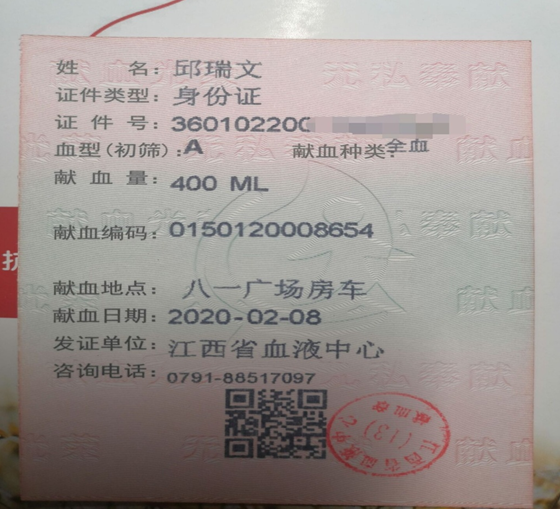 会计学院会计专业,19会计10班邱瑞文同学,用实际行动投入到这场“战疫中”,在“特殊时期”,为爱逆行,无偿献血。