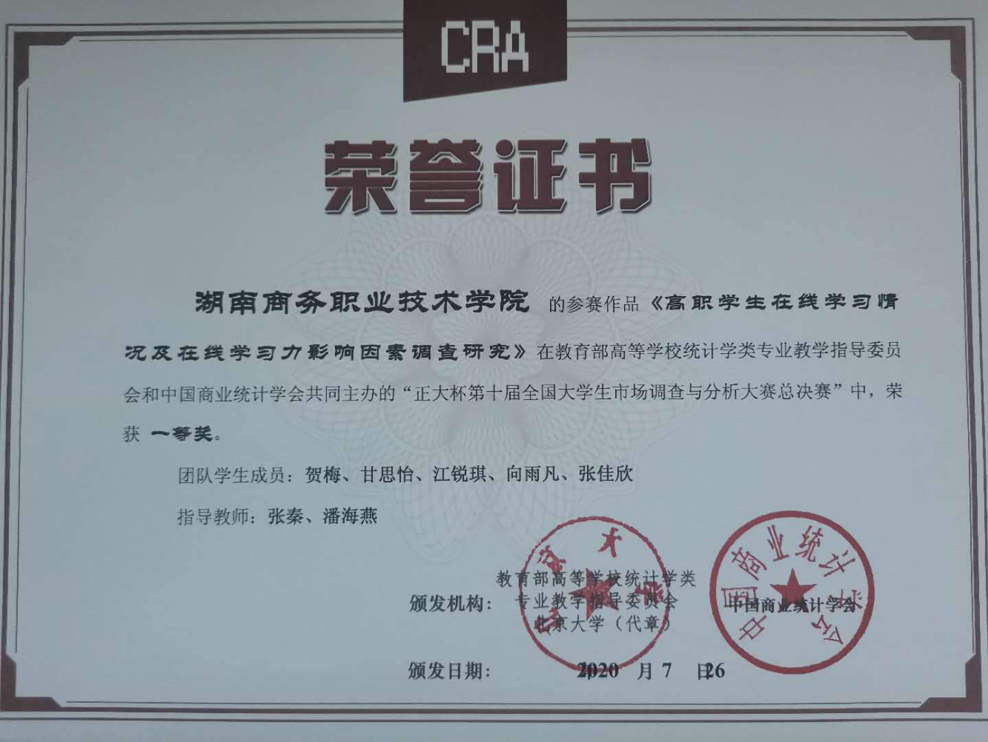 7月25-26日,由教育部高等学校统计学类专业教学指导委员会、中国商业统计学会共同主办,南京交通职业技术学院承办的“正大杯”第十届全国大学生市场调查与分析大赛专科组总决赛落下帷幕。经过激烈角逐,在全国各地118支参赛队伍中,由18级统计与会计核算专业贺梅、甘思怡、江锐琪、向雨凡、张佳欣5名同学组成的湖南商务职院代表队,在张秦老师和潘海燕老师共同指导下,荣获本次大赛全国一等奖的好成绩。