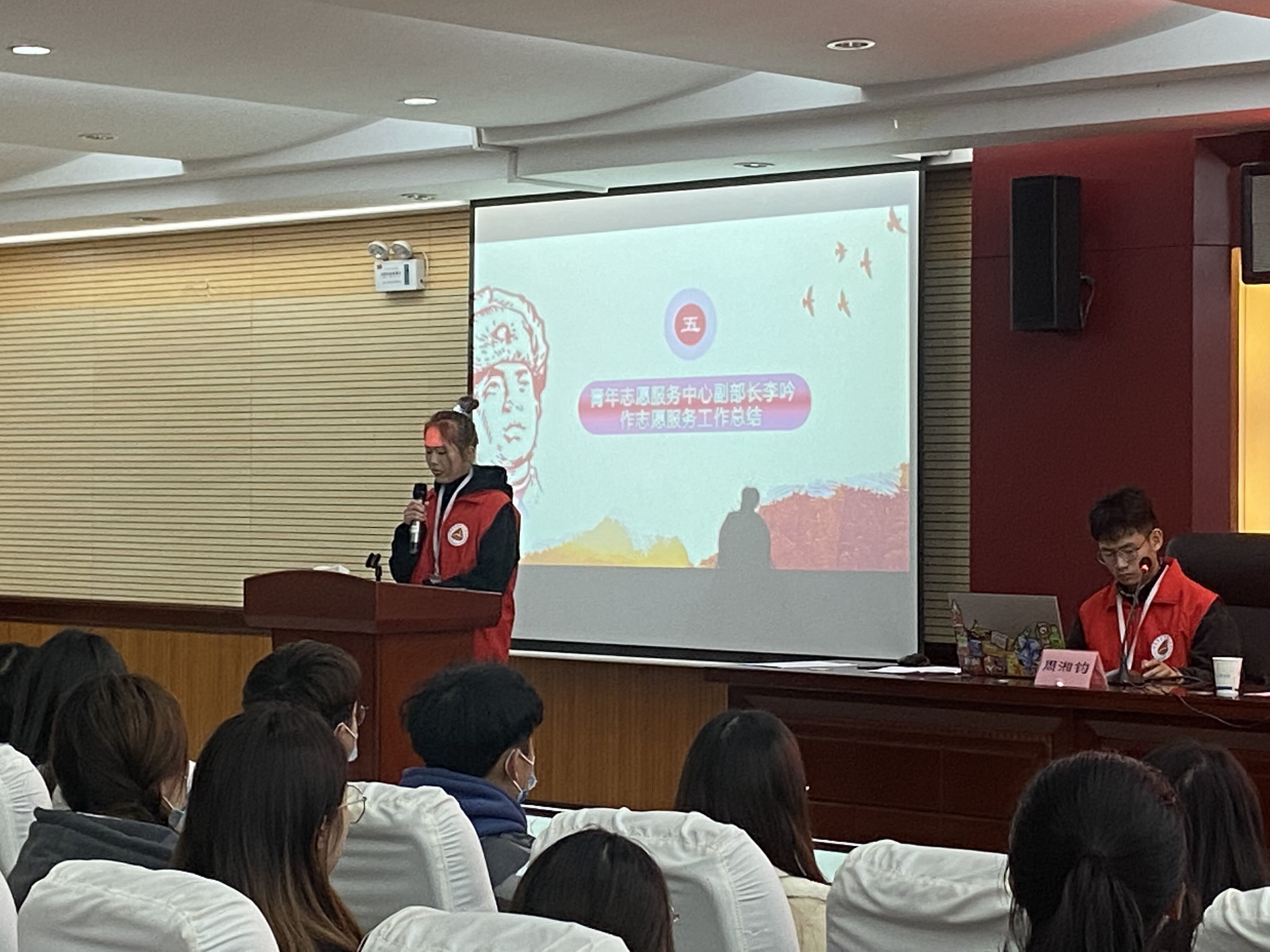 大会第五项,青年志愿服务中心副部长李吟进行2020年年度工作总结。坚持以“服务校园,奉献社会”为工作准则,积极响应学校的各项号召,配合其他部门开展工作。总结了2020年度的工作内容,指出了2020年度的工作不足,提出改进措施,并对2021年的工作进行展望。