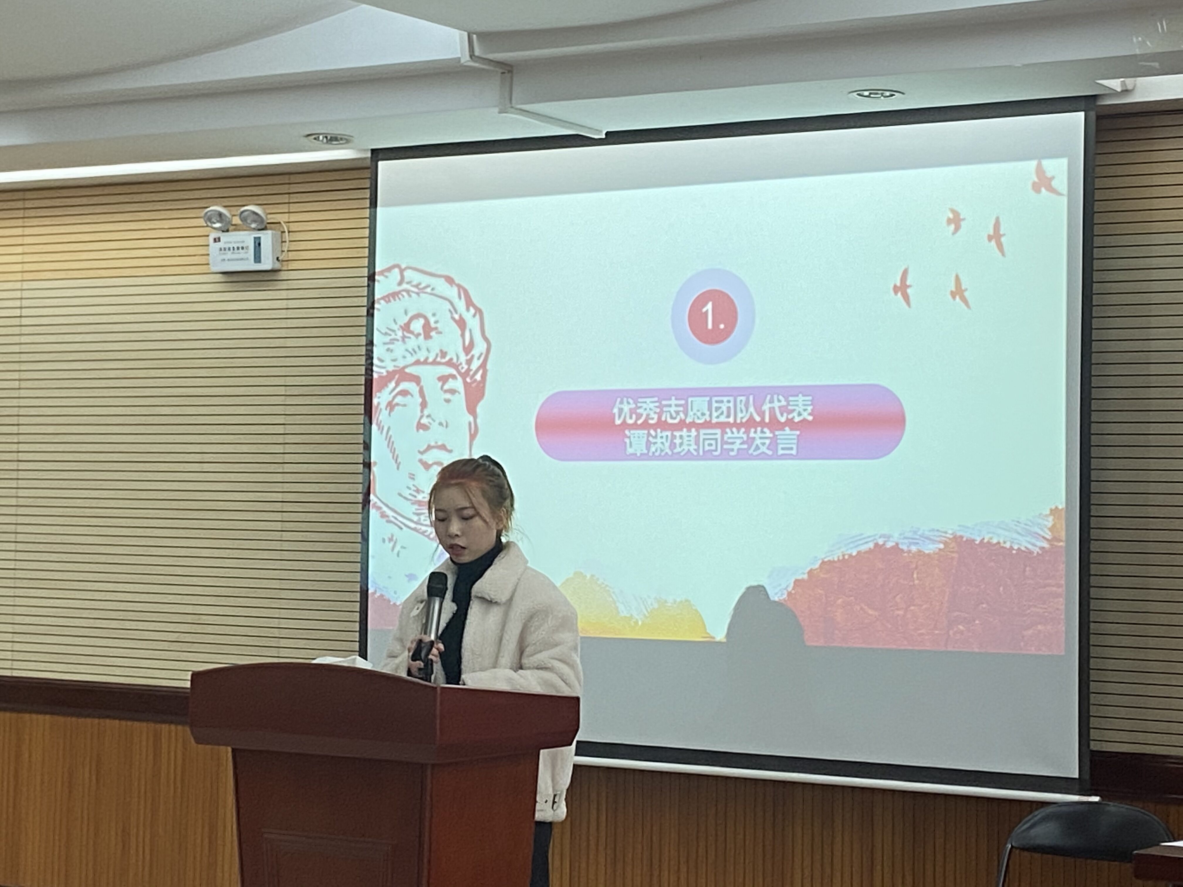 大会第八项,优秀志愿团队代表谭淑琪同学发言。谭淑琪同学所代表的团队用实际的志愿服务活动向我们展示了“用奉献点亮青春”,将“学习、服务、奉献、沟通”作为大学生自身定位。在背负的理想和信念,奉献我们的青春和热血下,投身到志愿服务当中。