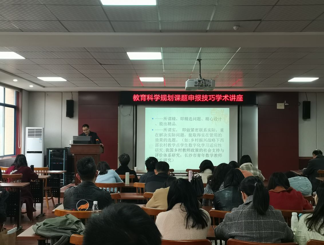 3月23日下午14:30,我院在二教201室开展了关于教育科学规划课题申报技巧学术讲座,本次讲座由湖南省教科院盛正发主讲。他针对如何写好项目申请书,更好的实现教学与科研相辅进行了心得分享,讲述了其心路历程,并且从微观角度进行了剖析。