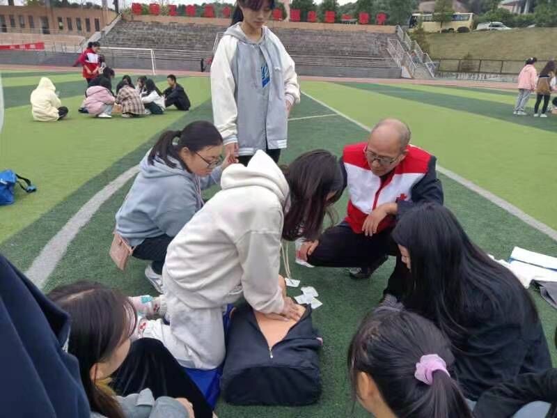 随后,为了更充分掌握应急救援技能,同学们来到校田径场,就心肺复苏、气道异物梗阻等应急救护技能进行分组现场演练。