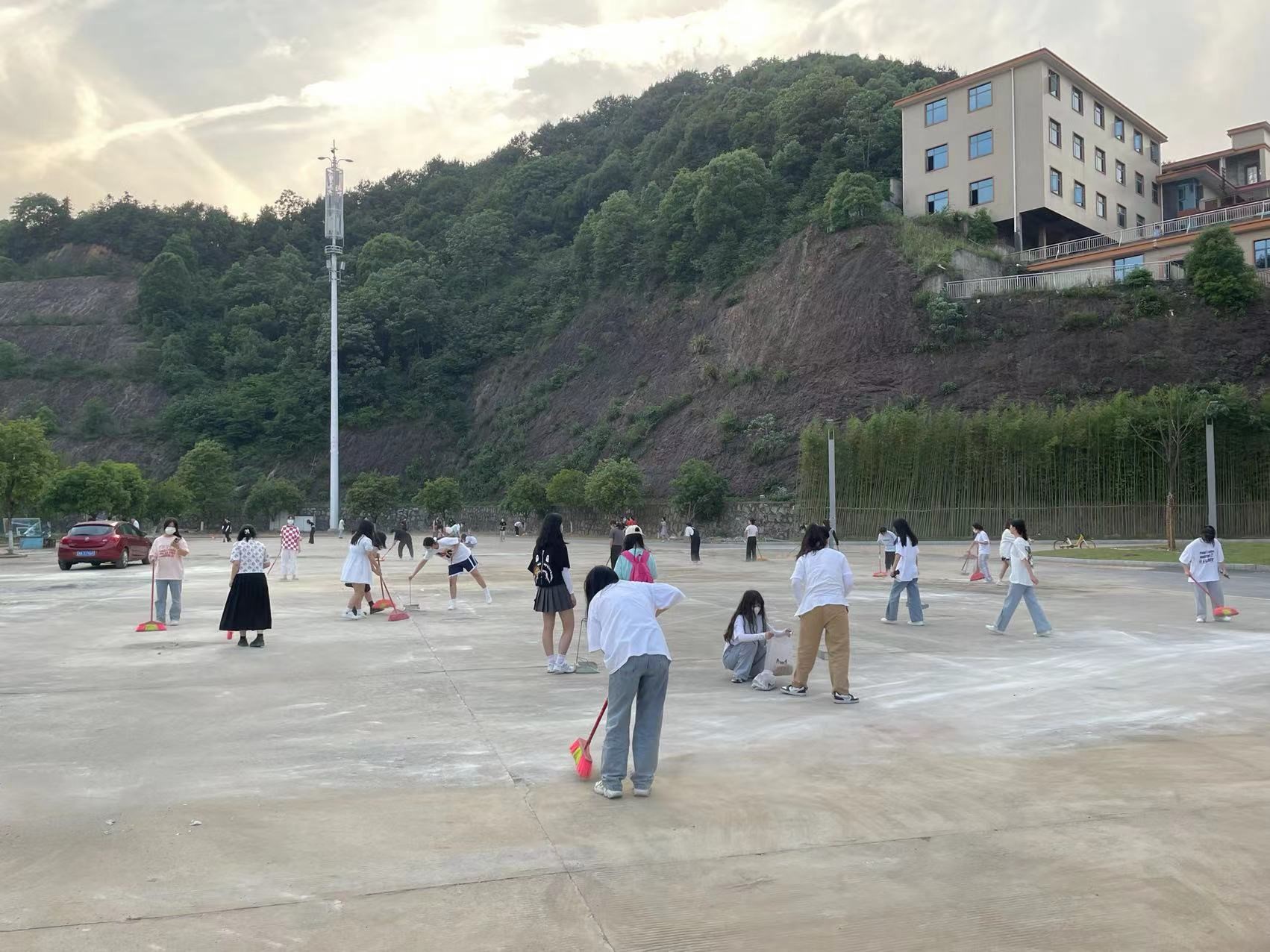 本次义务活动主要劳动范围为篮球场与产教融合楼之间的水泥地广场。活动中,曾大为老师对同学们进行明确分工,认真巡查同学们的清扫工作;同学们认真负责、相互合作,手持扫帚、撮箕等工具,对广场上的石块碎渣、尘土等垃圾进行了集中清扫和清倒。经过两个小时的团结协作和认真清扫,广场上的石块和尘土被清理得干干净净。