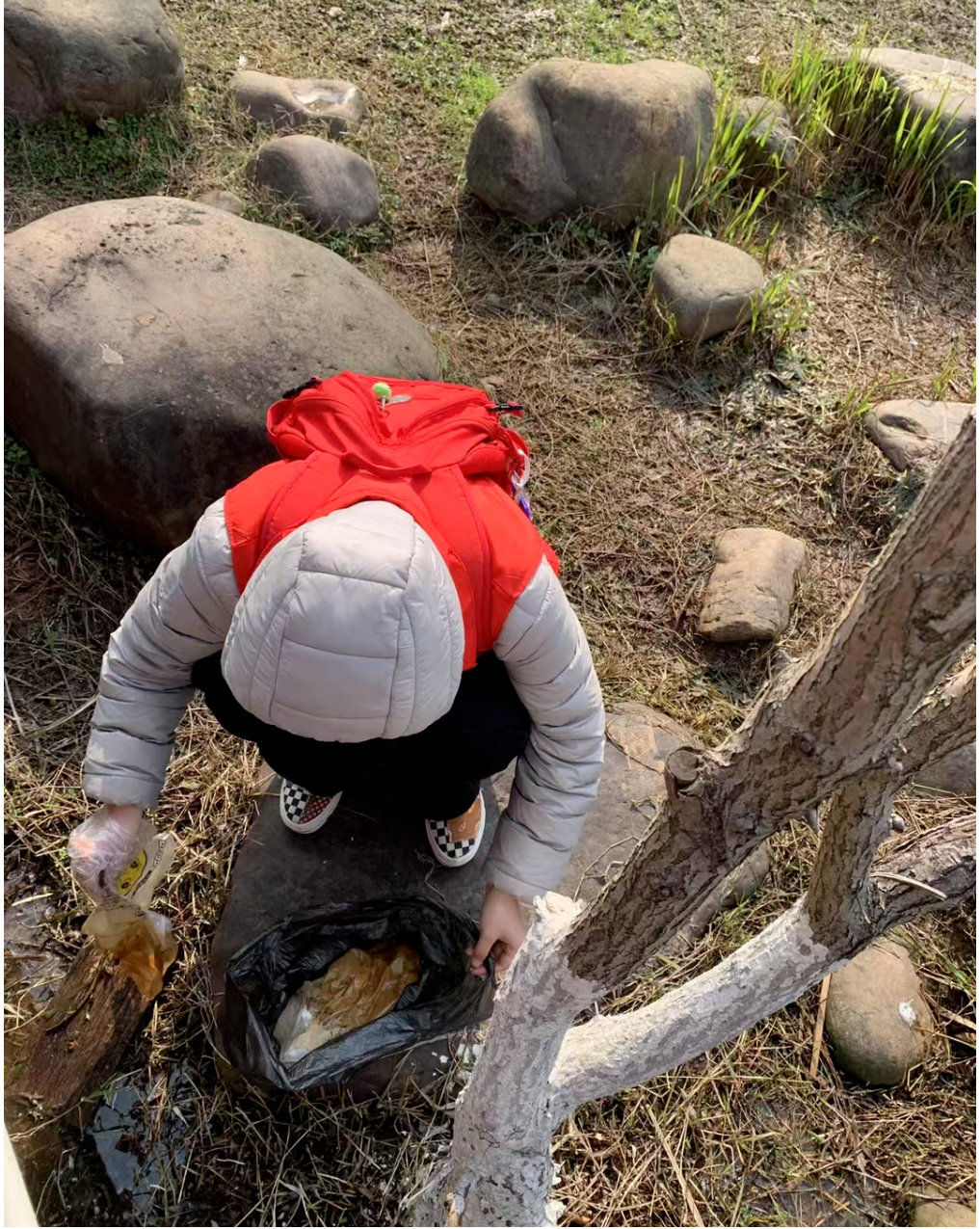 在社区环境中,同学们同样展现了高度的热情与责任感。他们手持垃圾夹和垃圾袋,沿着步道、深入草丛,认真捡拾烟头、纸屑、塑料包装等废弃物。面对一些角落、灌木丛中的卫生死角,大家相互协作,耐心清理,不怕脏、不怕累,用实际行动改善社区公共空间环境,赢得了社区工作人员与过往居民的赞赏。