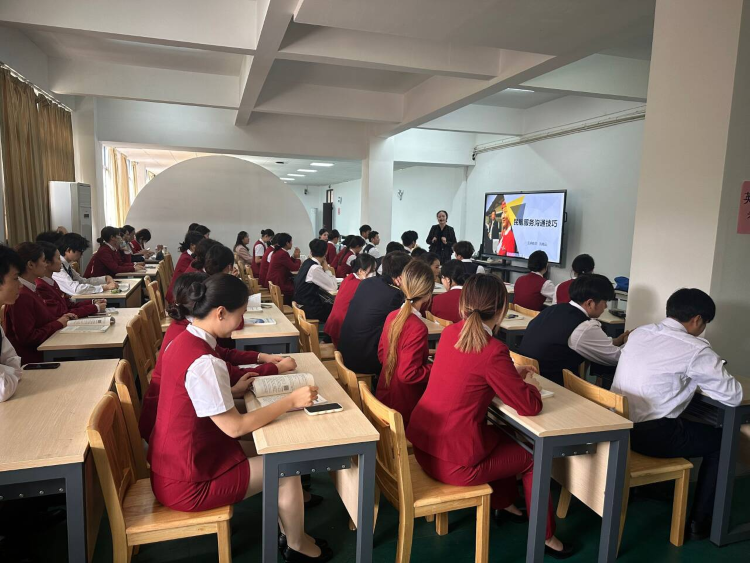 2024年11月5日下午,旅游管理学院空中乘务专业刘南云老师的《民航服务沟通技巧》公开课在学院的空舱仿真模拟实训室展开。旅游管理学院教学副院长、空中乘务专业全体任课老师等12位教师分别到场听课。