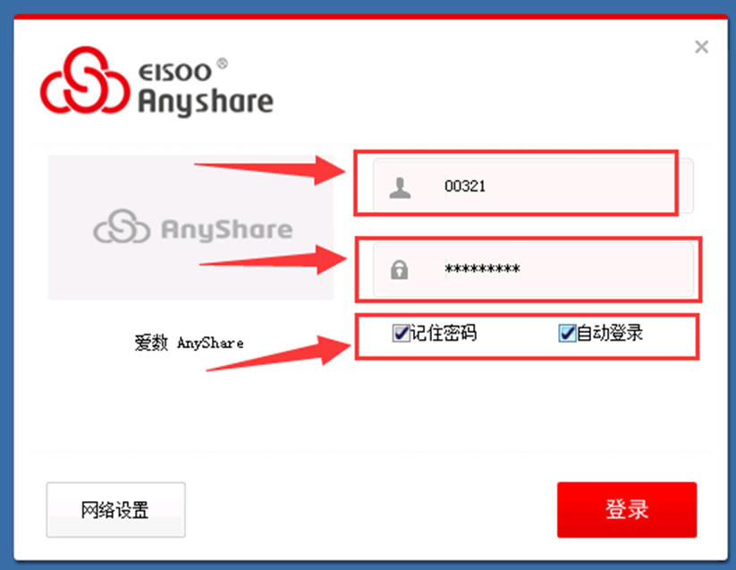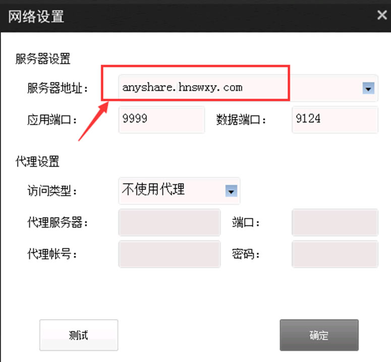 (6)如果你在“(4)”步中勾选了第4项“安装完成后启动 爱数AnyShare”,那么你将会看到如下图所示的窗口。如果没看到如下图所示的窗口,请到你的电脑桌面上找到“爱数AnyShare 5.0”的应用程序图标,双击打开后也能看到如下图所示的窗口。在“服务器地址:”栏内填上“anyshare.hnswxy.com”,其他参数不能改。单击“确定”