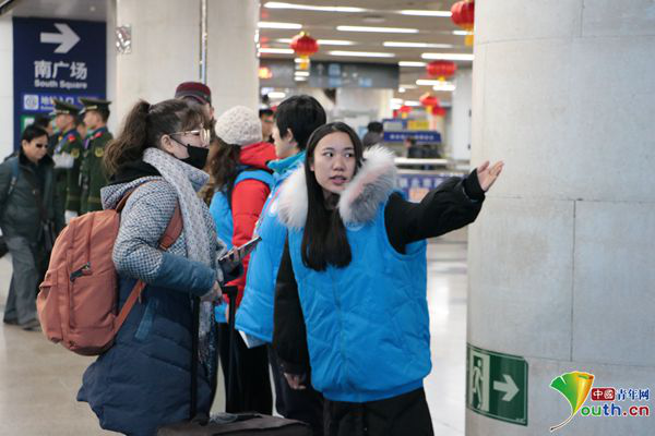 北京西站,青年志愿者为旅客进行指引服务。中国青年网记者 李川 摄