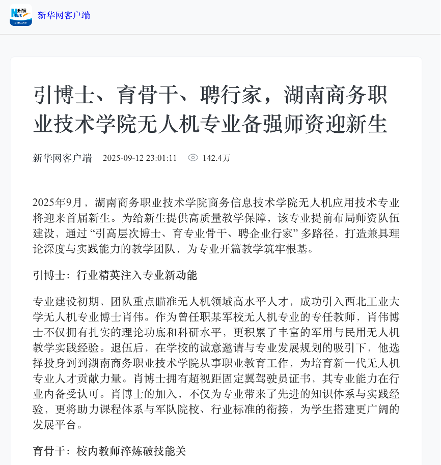 新华网报道——引博士、育骨干、聘行家,湖南商务职业技术学院无人机专业备强师资迎新生