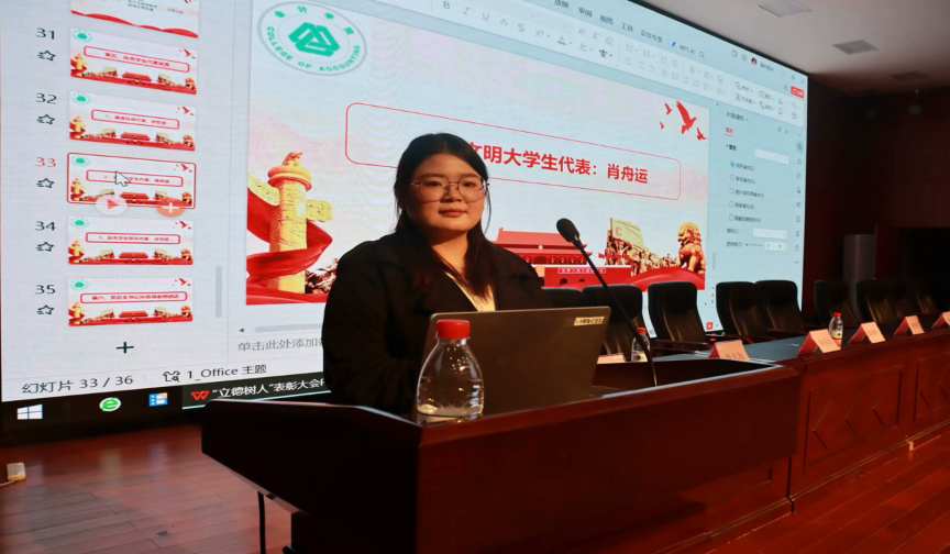 本次大会会计学院共表彰了10个“文明班级”、98名“德育标兵”、88名“文明大学生”、30名“优秀学生部员”、8名“优秀助辅”、5名“新闻先进个人”。受表彰代表依次上台发表感言,其中,23统计与会计1班的肖舟运同学作为文明大学生代表,将自己在校学习中的点滴历程与日常生活里的细微感悟娓娓道来,就学习、工作、奉献等层面分享着自己的闪烁历程,展现出积极向上的精神风貌,为同学们树立了良好的标杆,呈现出了当代文明大学生的风采,赢得了同学们的阵阵掌声。