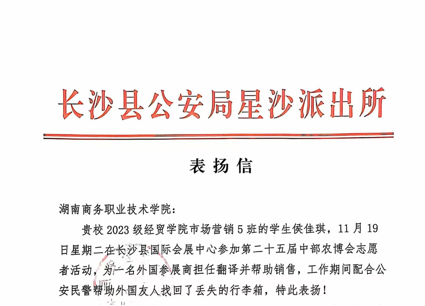 近日,湖南商务职业技术学院收到了一封来自长沙县公安局星沙派出所的感谢信,信中的文字记录了11月19日在长沙国际会展中心,一场关于爱心与责任的温暖故事。当日,长沙市农博会正如火如荼地进行,一位名叫Henery Mulenga的外国展商在参展期间不慎将装有重要物品的行李箱遗落在出租车上,引发了一场紧急的寻找行动。