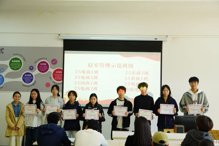 表彰过后,23农村电商1班张秀娟同学作为优秀学风班级代表发言,分享“师生同心、朋辈互助”的建设经验;25级电商1班樊昱熙代表寝室管理示范班级发言,介绍了“制度共建、文化聚力”的寝室管理模式,纷纷表示将珍惜荣誉、为学院学风建设贡献更多力量。