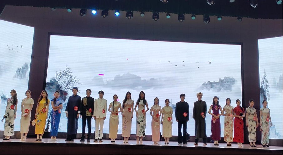 经过前期初赛选拔,共有20名选手晋级决赛。比赛分为两个环节:第一轮为集体展示,15名女生身着典雅旗袍,5名男生则分别演绎中山装与长衫造型,以稳健而优雅的步伐,将传统服饰的端庄与青春活力巧妙融合,展现东方美学韵味,赢得现场阵阵掌声。