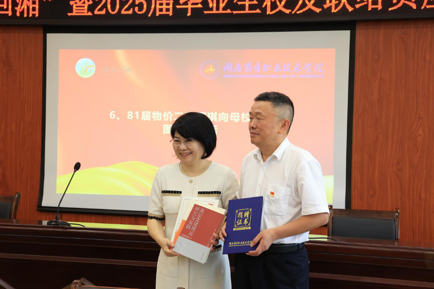 随后的分享环节,校友们的故事如时光画卷徐徐展开:岳阳校友会会长文选寄语学弟学妹大展宏图,为母校增光添彩;株洲校友会秘书长杨建新动情讲述从职场新人到行业骨干的蜕变之路;长沙校友会副会长陈煜博分享创业维艰中的破局智慧;81届棉检班苏光荣追忆恩师教诲同窗情,往事历历惹人怀。往昔的课堂点滴、社团趣事被一一唤醒,会场内掌声与欢笑交织。81届物价二班周琪校友更向母校捐赠其主编、获省级权威部门和专家高度肯定的党建书籍3种3册,为湖南基层党建服务指引,为全国献上湖南经验。