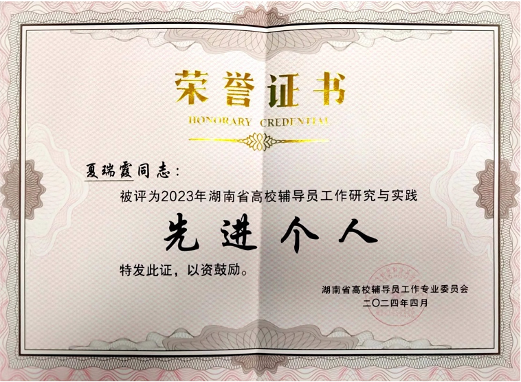 4月8日,由中共湖南省委教育工委、湖南省教育厅指导,湖南省高校辅导员工作专业委员会、学生工作专业委员会主办的2023年年会在吉首大学召开。我院被评为“2023年湖南省高校学生工作研究与实践先进单位”,辅导员夏瑞霞被评为“2023年湖南省高校辅导员工作研究与实践先进个人”、宁和南被评为“2023年湖南省高校学生工作研究与实践先进个人”。