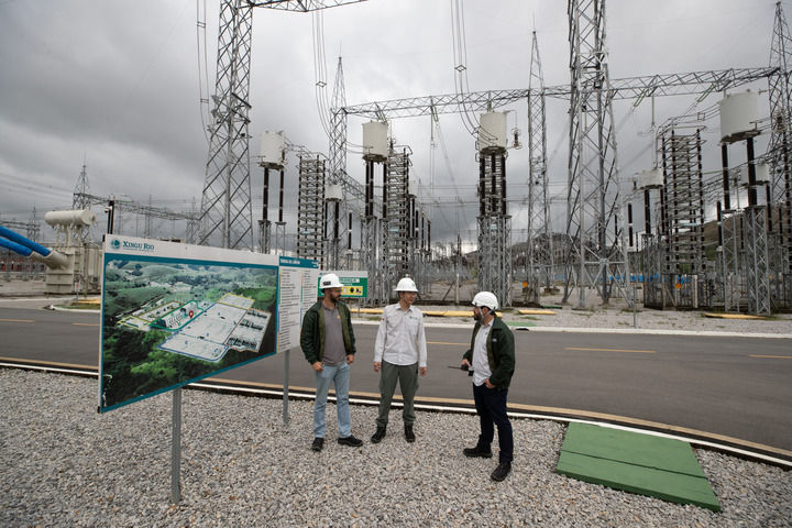 2022年9月30日,在巴西里约热内卢美丽山特高压输电二期项目里约换流站,国网巴控公司换流站运维主管(中)和巴方人员交谈。(新华社记者 王天聪/摄)