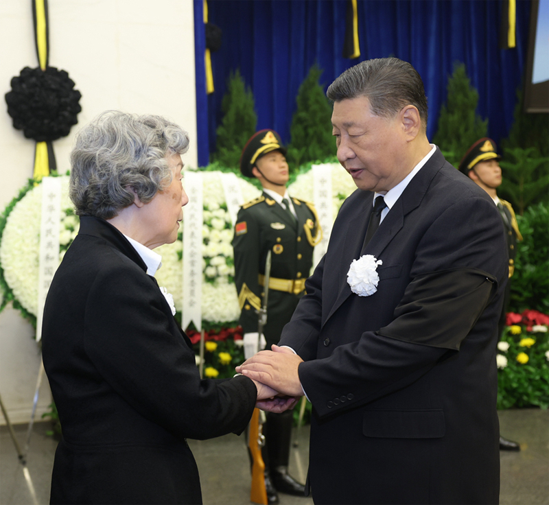 10月14日,吴邦国同志遗体在北京八宝山革命公墓火化。习近平、赵乐际、王沪宁、蔡奇、丁薛祥、李希、韩正等前往八宝山送别,胡锦涛送花圈表示哀悼。这是习近平与吴邦国亲属握手,表示深切慰问。(新华社记者 鞠鹏/摄)