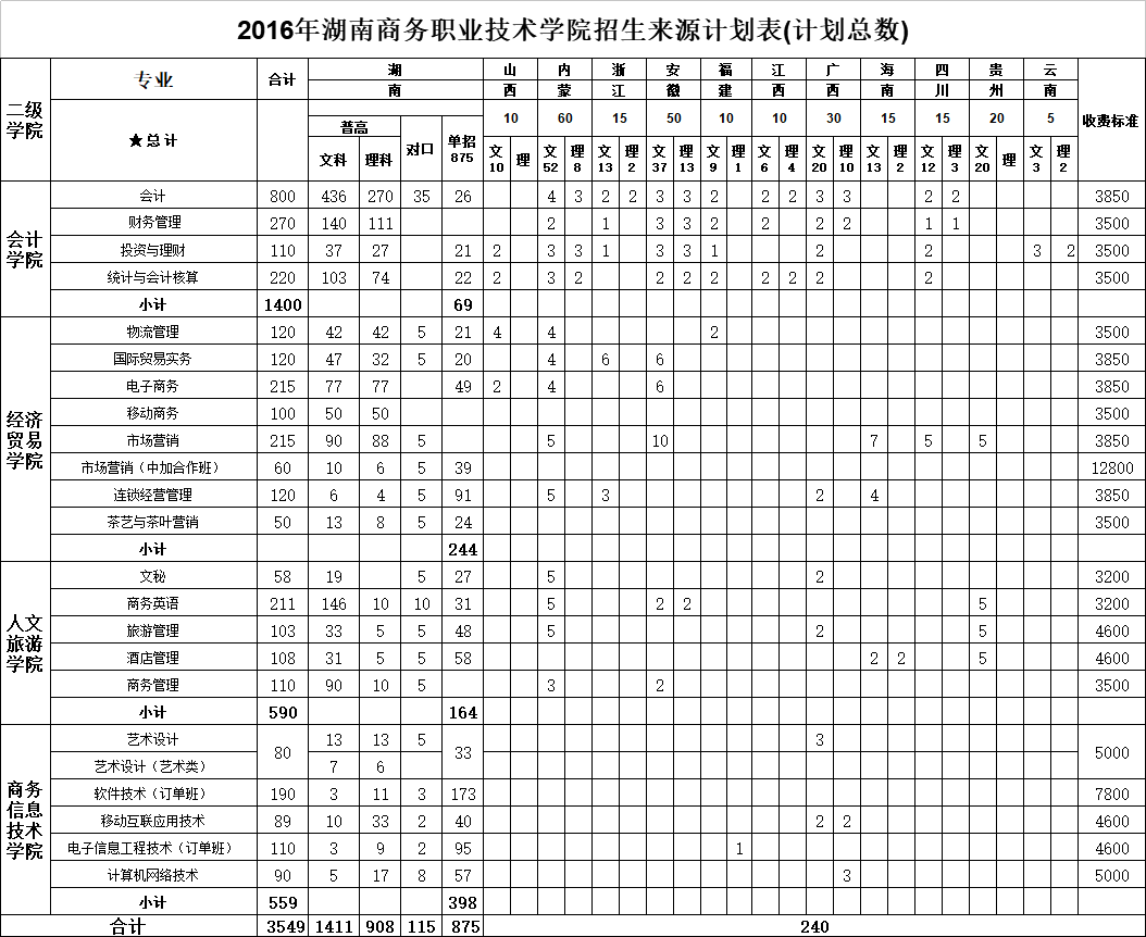 2016年湖南商务职业技术学院招生计划表